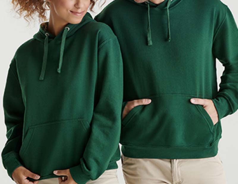 Sudadera capucha con bolsillo canguro y cordón ajustable. Puños y cinturilla de punto canalé 1×1 con elastano.